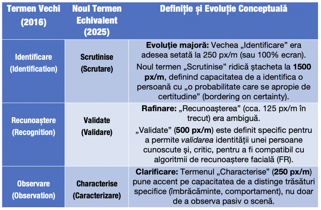 3.2 Redefinirea granulară a obiectivelor de vizualizare – Cea mai semnificativă actualizare terminologică vizează descriptorii calității imaginii. Vechii termeni generici „Recunoaștere” și „Identificare” (adesea confundați sau interpretați subiectiv) au fost înlocuiți sau redefiniți cu termeni care implică o certitudine matematică și o utilitate probatorie specifică.