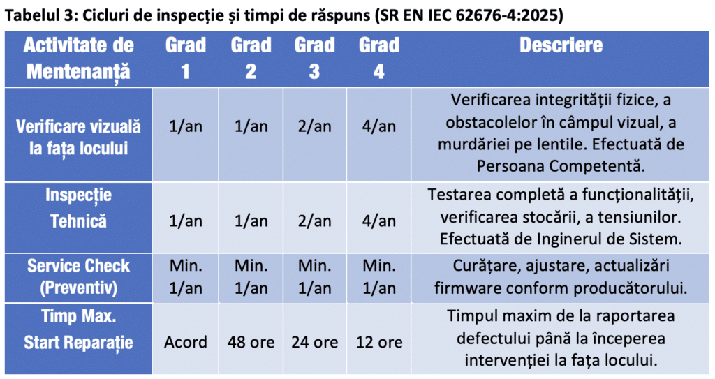 Implicații operaționale: Pentru un obiectiv critic (Grad 4), operatorul este obligat legal (prin adoptarea standardului în contracte) să asigure 4 inspecții tehnice și 4 verificări vizuale anual. Mai mult, furnizorul de mentenanță trebuie să garanteze contractual o prezență la intervenție în sub 12 ore. Nerespectarea acestor termene poate atrage răspunderea juridică în cazul unui incident de securitate.