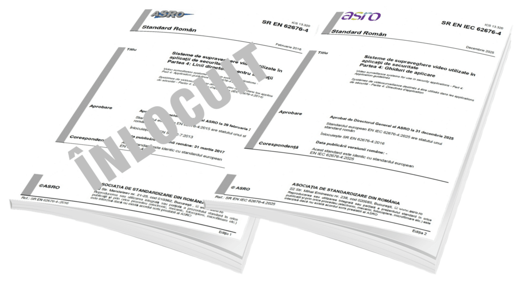 - SR EN IEC 62676-4:2025 Sisteme de supraveghere video utilizate în aplicații de securitate – Partea 4: Ghiduri de aplicare. (Standard identic cu EN IEC 62676-4:2025).