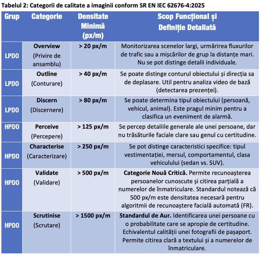 1.1 Necesitatea revizuirii standardului din 2016 – Ediția din 2016 a standardului SR EN 62676-4 a fost elaborată într-o perioadă de tranziție tehnologică. Deși recunoștea existența sistemelor digitale, terminologia și metricile sale erau încă puternic ancorate în moștenirea televiziunii analogice (PAL/NTSC). Concepte precum „procentajul din înălțimea ecranului” pentru definirea calității imaginii deveniseră ambigue odată cu proliferarea formatelor HD (16:9), 4K și a senzorilor cu rapoarte de aspect variate. Mai mult, absența unor cerințe mandatorii stricte privind mentenanța a dus, în practică, la degradarea performanțelor sistemelor instalate, acestea devenind adesea inutile în momentul incidentelor de securitate.