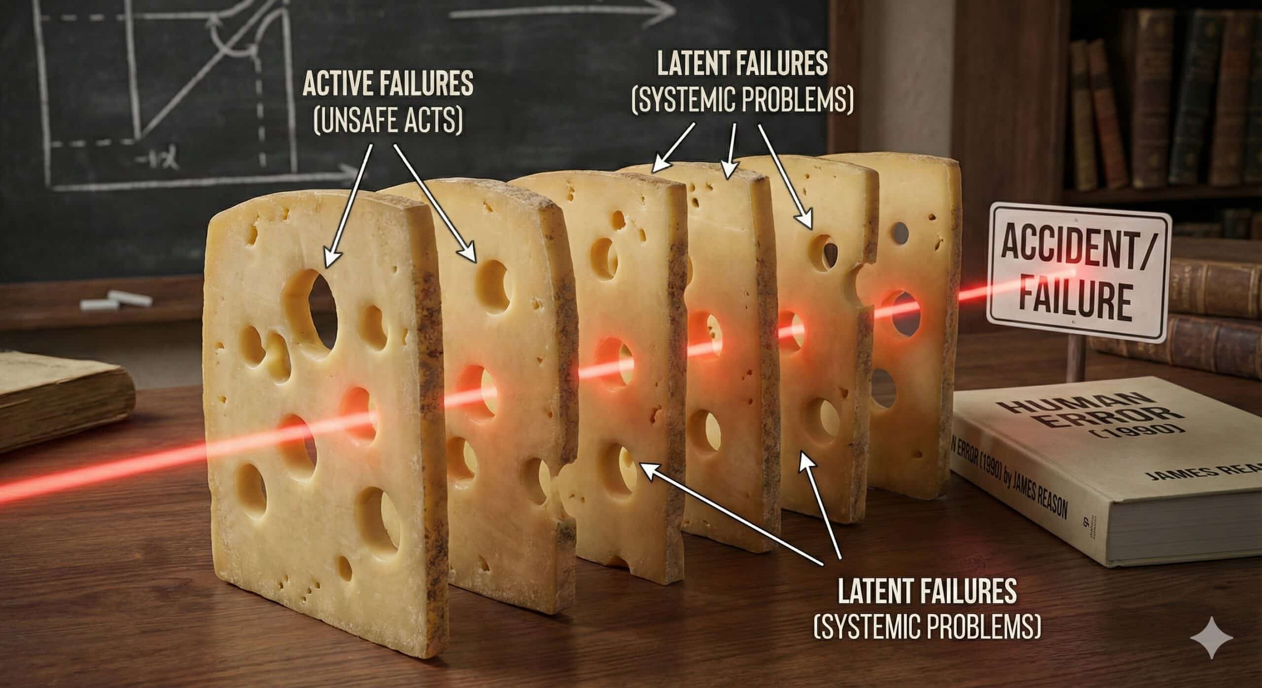James T. Reason a dezvoltat modelul “Swiss Cheese” bazându-se pe teoria sa despre “Eșecurile active și latente”propusă pentru prima dată în cartea sa din 1990, „Human Error“. Modelul distinge între eșecurile active, erori operaționale imediate precum un agent de securitate care adoarme, și eșecurile latente, condiții organizaționale subiacente precum personal insuficient din cauza reducerilor bugetare care creează vulnerabilități cu mult înainte de apariția incidentelor. Cadrul lui Reason identifică patru niveluri unde își au originea eșecurile: influențe organizaționale (decizii de politică, cultura corporativă), supraveghere nesigură (supraveghere inadecvată, instruire deficitară), precondiții pentru acte nesigure (factori de mediu, proceduri defectuoase) și actele nesigure în sine (erori și încălcări la nivel operațional).