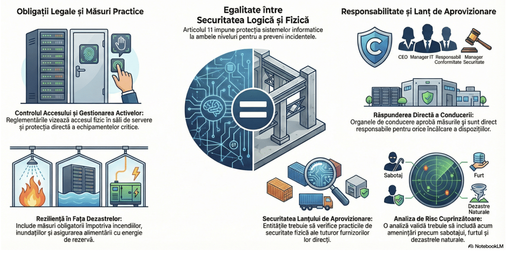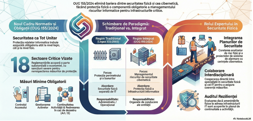 Un aspect al acestei ordonanțe merită însă atenție specială din partea celor care lucrează în domeniul securității fizice. Articolul 11 alineatul (4) din OUG 155/2024 spune ceva ce merită toată atenția noastră: măsurile de gestionare a riscurilor trebuie să asigure protecția rețelelor și sistemelor informatice „atât la nivel logic, cât și fizic împotriva incidentelor”. Această formulare nu lasă loc de interpretare. Securitatea fizică nu mai este un subiect care aparține exclusiv Legii 333/2003 și normelor sale de aplicare; ea devine o componentă obligatorie a managementului riscurilor de securitate cibernetică.