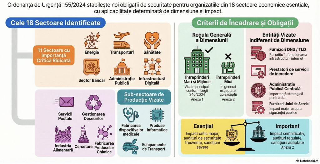 ATENȚIE! Nu orice organizație din aceste sectoare intră automat sub incidența legii. Articolele 5 și 6 fac o distincție importantă între entități esențiale și entități importante, iar Articolul 8 introduce criteriul de dimensiune. Ca regulă generală, obligațiile se aplică întreprinderilor mari și mijlocii, adică cele care depășesc pragurile stabilite de Legea 346/2004 privind IMM-urile, dar există și excepții semnificative.