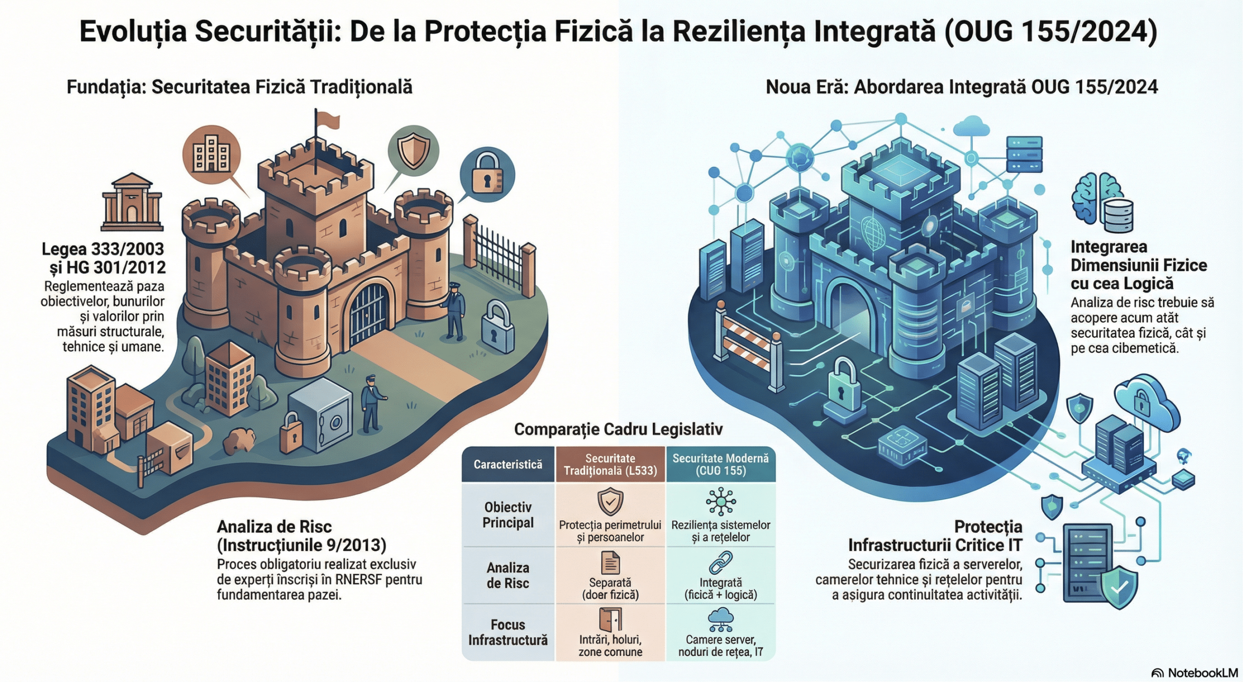 Legea 333/2003, HG 301/2012 și Instrucțiunile nr. 9/2013 rămân în vigoare și continuă să se aplice până la eventualele modificări. OUG 155/2024 nu le înlocuiește și nu le modifică. Ceea ce schimbă însă fundamental este faptul că adaugă un strat suplimentar de obligații pentru entitățile din cele 18 sectoare critice. Nu mai este suficient să ai o analiză de risc la securitate fizică realizată conform Instrucțiunilor nr. 9/2013, un plan de pază aprobat și un sistem de supraveghere video funcțional conform Legii 333. Trebuie să demonstrezi că măsurile tale de securitate fizică protejează și rețelele și sistemele informatice ale organizației, conform cerințelor Articolului 11 și Articolului 13 din OUG 155/2024.
