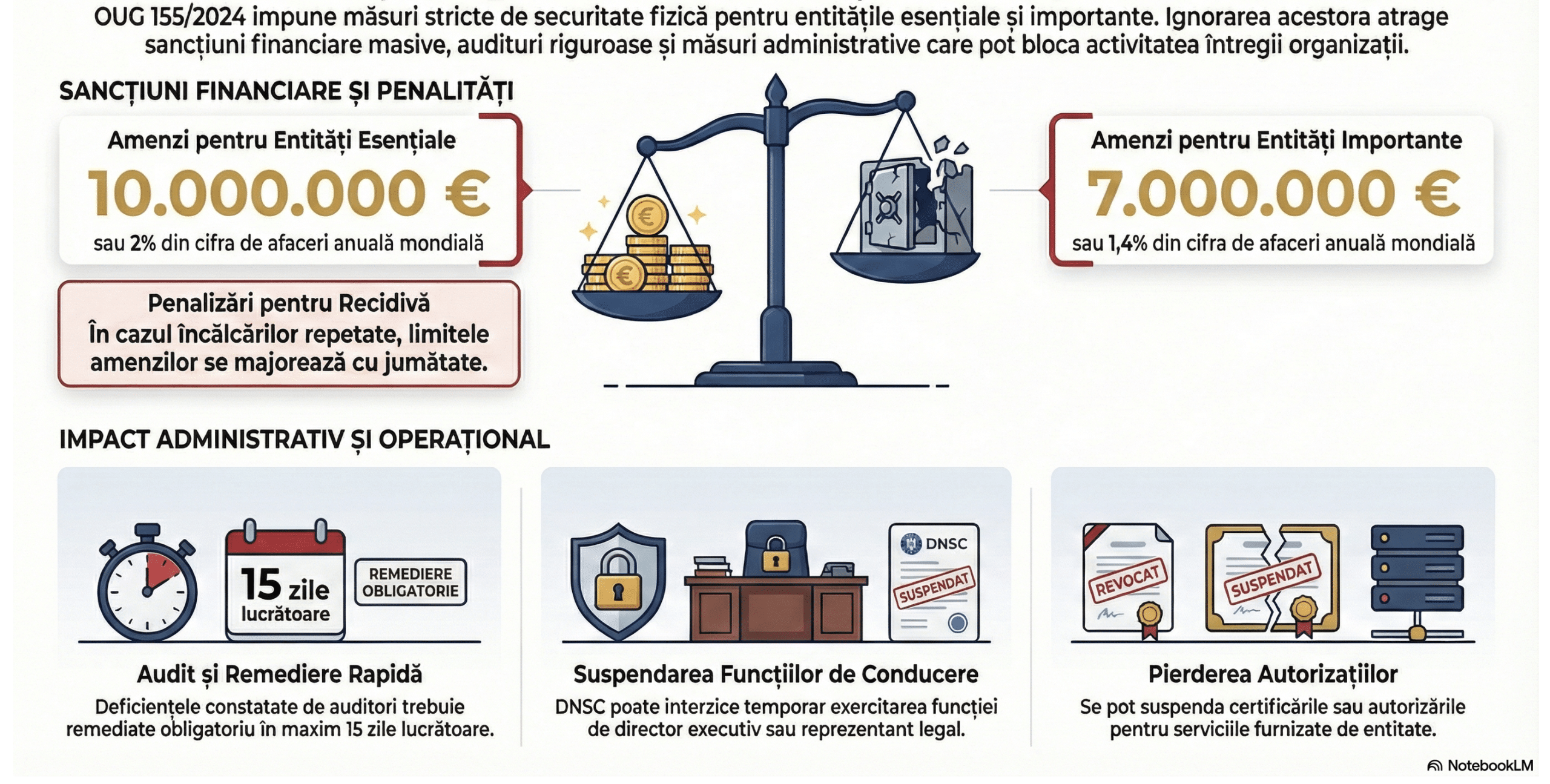 Să începem cu problema aia neplăcută: sancțiunile. Articolul 60 din OUG 155/2024 stabilește un regim contravențional cu praguri semnificative. Pentru entitățile esențiale, amenzile pot ajunge până la 10.000.000 de euro sau 2% din cifra de afaceri anuală la nivel mondial, aplicându-se valoarea cea mai mare. Pentru entitățile importante, plafonul este de 7.000.000 de euro sau 1,4% din cifra de afaceri mondială. Nerespectarea obligației de a lua măsuri tehnice, operaționale și organizatorice conform Articolului 11 alineatul (1), care include explicit protecția la nivel fizic, se numără printre contravențiile sancționabile conform Articolului 60 alineatul (1) litera a).
