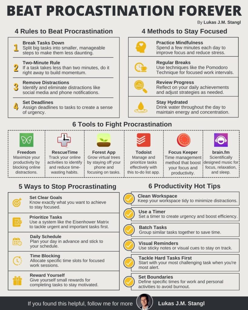 Învingerea procrastinării începe prin conștientizarea faptului că este o problemă și prin aplicarea unor strategii eficiente pentru a o combate. Acestea includ setarea unor obiective clare, prioritizarea sarcinilor, planificarea zilei, blocarea timpului pentru activități importante și folosirea unor tehnici pentru menținerea concentrării. Este important să îți amintești că fiecare pas înainte, oricât de mic, te aduce mai aproape de succes și te ajută să îți îndeplinești obiectivele.