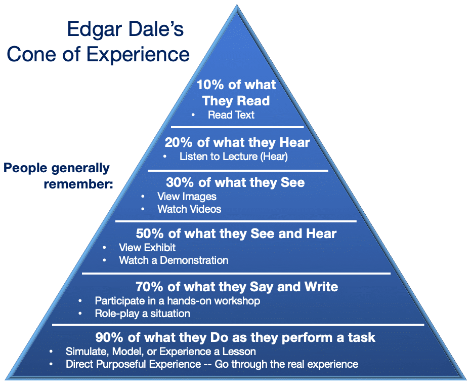 During the 1960s, Edgar Dale theorized that learners retain more information by what they “do” as opposed to what is “heard”, “read” or “observed” (Cone of Experience).