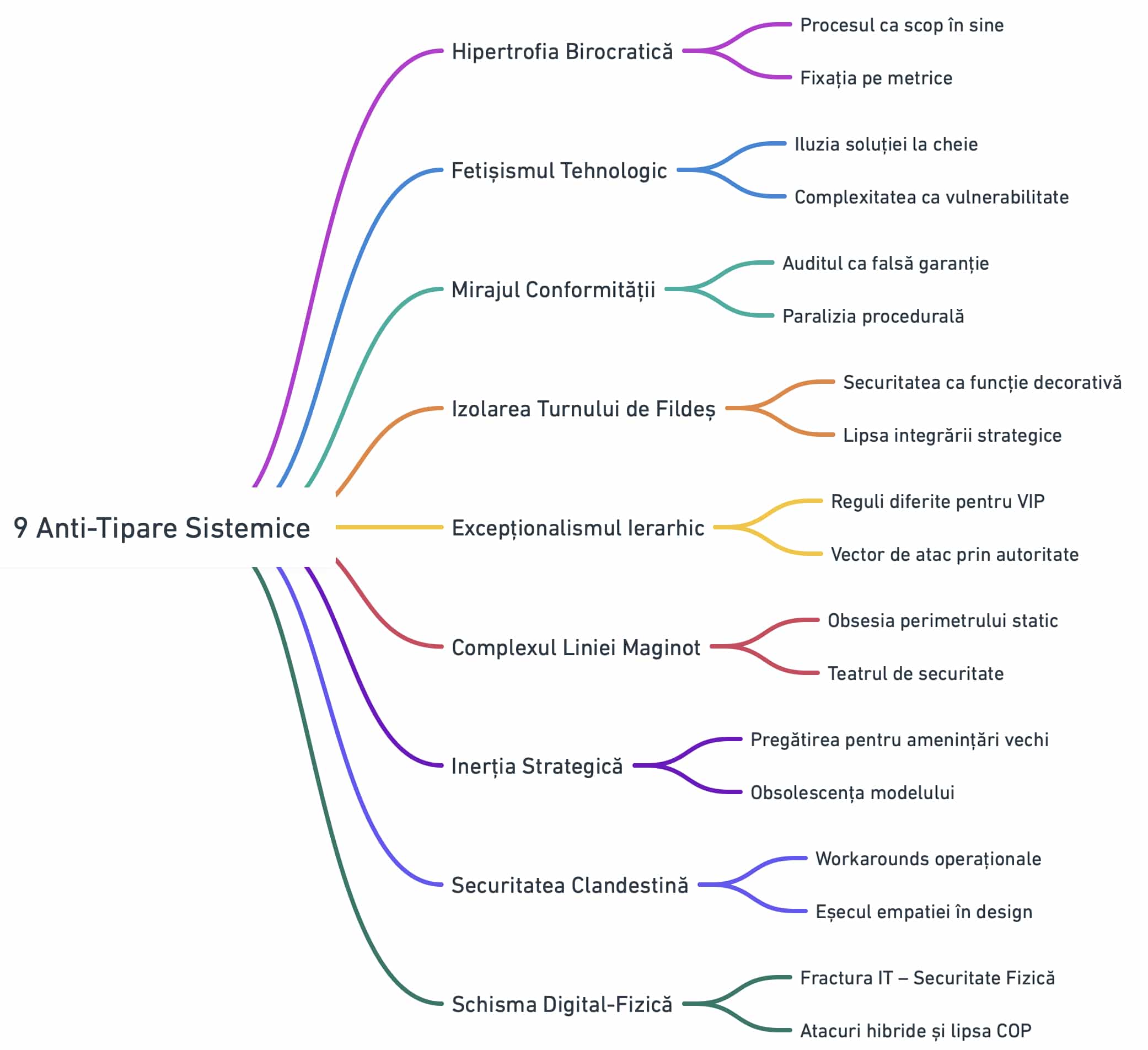 Procesul ca scop în sine – Acest anti-tipar se manifestă prin creșterea excesivă a stratului administrativ în detrimentul funcției operative. Organizația este victima unei confuzii fundamentale între harta riscului (documentația) și teritoriul riscului (realitatea din teren). Manifestarea principală este generarea de “artefacte de securitate”, rapoarte masive și proceduri de sute de pagini, care servesc doar pentru a justifica existența departamentului, nu pentru a proteja activul.