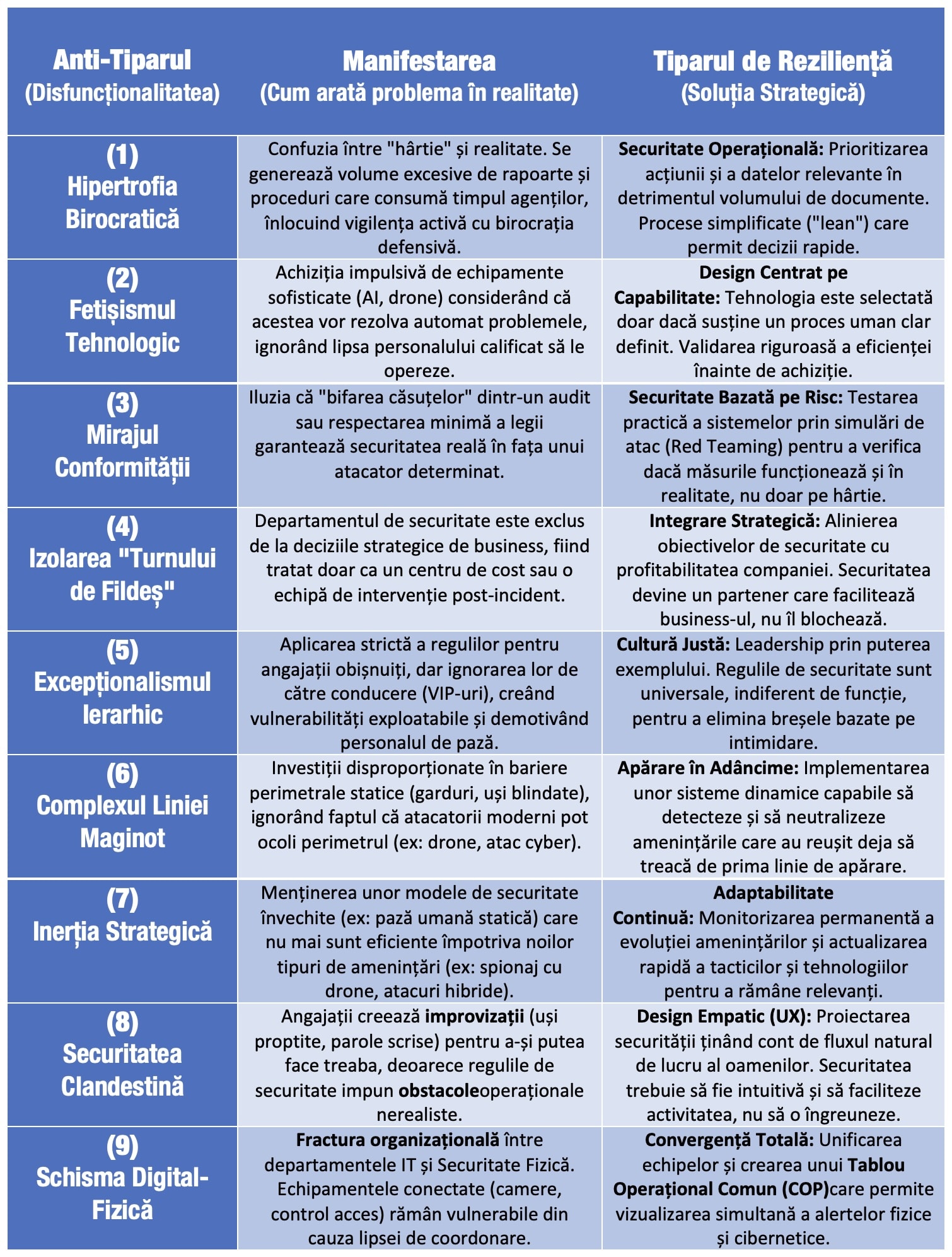 Analiza celor nouă anti-tipare ne permite să trecem de la o abordare reactivă, bazată pe căutarea vinovaților, la una proactivă, bazată pe optimizarea sistemelor. Tabelul următor funcționează ca un instrument de diagnostic rapid pentru liderii organizaționali. El pune în oglindă Anti-Tiparul (modelul de eșec structural) cu Tiparul de Reziliență (soluția arhitecturală corectă), oferind o foaie de parcurs clară pentru transformarea funcției de securitate fizică.