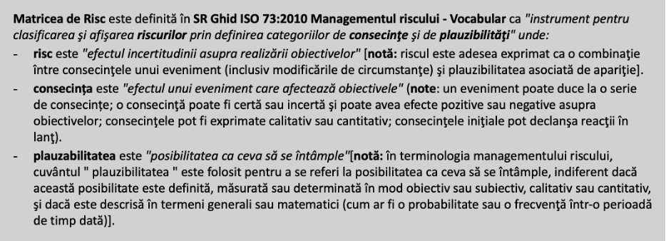 La cursurile mele, “Evaluator de risc la securitatea fizică” și “Managementul riscului și tehnici de evaluare a ricului” discutăm în detaliu, în cadrul tehnicilor de înregistrare și raportare, “Matricea de Risc“, sau, așa cum este numită în standardul SR EN IEC 31010:2020 Managementul riscului. Tehnici de evaluare a riscului, “Matricea consecință/plauzibilitate (matricea riscului sau harta căldurii)“ care precizează că aceasta “este o modalitate de a prezenta riscurile în funcție de consecința și de plauzibilitatea acestora și de a combina aceste caracteristici pentru a prezenta o clasificare a semnificației riscului”.