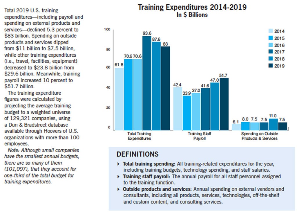 Low Cost – another advantage of online learning is the low cost, much more affordable than conventional learning offerings. In the ˝How Long Does it Take to Create Learning?˝ study, made by Chapman Alliance it has been shown that a half-day of classical training is equivalent to a one-hour e-learning course. In 2019, U.S. training expenses amounted to $83 billion! 35,6% of that was spent on travel, training facilities, in-house training development, and equipment (2019 Training Industry Report).