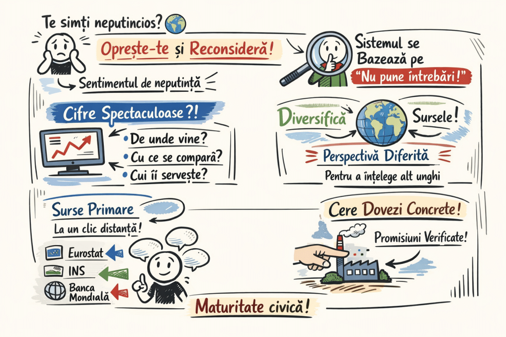 Nu ai nevoie de instrumente speciale, de cunoștințe de expert sau de acces la informații clasificate. Ai nevoie de câteva discipline mentale pe care le poți exersa începând de astăzi. Cea mai importantă este reflexul verificării: ori de câte ori o cifră spectaculoasă apare pe ecranul tău, oprește-te înainte de a o distribui sau de a o comenta și întreabă-te de unde vine, cu ce se compară și cui îi servește. Sursele primare sunt publice și accesibile. Eurostat, Institutul Național de Statistică, rapoartele Băncii Mondiale nu sunt documente secrete. Sunt la un clic distanță, iar consultarea lor nu necesită studii de economie, ci doar răbdare și onestitate intelectuală.