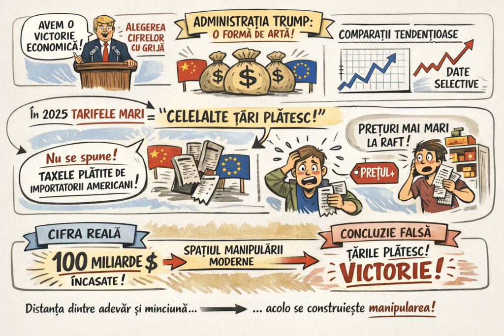 Primul lucru pe care trebuie să-l înțelegi este că manipularea modernă rareori implică minciuni în sensul clasic al cuvântului. Un lider politic care anunță o performanță economică spectaculoasă face, de cele mai multe ori, ceva mai subtil: alege cu grijă ce cifre prezintă, din ce perioadă, comparate cu ce referință și lasă publicul să tragă singur o concluzie greșită. Administrația Trump a transformat această tehnică într-o formă de artă. În 2025, tarifele vamale masive impuse importurilor au fost prezentate public drept o victorie economică, un instrument prin care „celelalte țări plătesc în sfârșit”. Ceea ce nu s-a spus — pentru că ar fi stricat povestea — este că tarifele vamale sunt plătite de importatorii americani și, în cele din urmă, de consumatorul american, prin prețuri mai mari la raft. Cifra de titlu era reală. Concluzia pe care erai invitat să o tragi era falsă. Iar distanța dintre cele două este exact spațiul în care se construiește manipularea modernă. Cu toate acestea, privatizarea realității nu operează doar prin cosmetizarea pozitivă a faptelor. Funcționează la fel de eficient și în direcția opusă: prin transformarea unor tragedii reale în narativul „sacrificiului necesar” — un narativ în care oricine pune întrebări despre costul uman sau economic devine, automat, nepatriotic, laș sau lipsit de viziune.