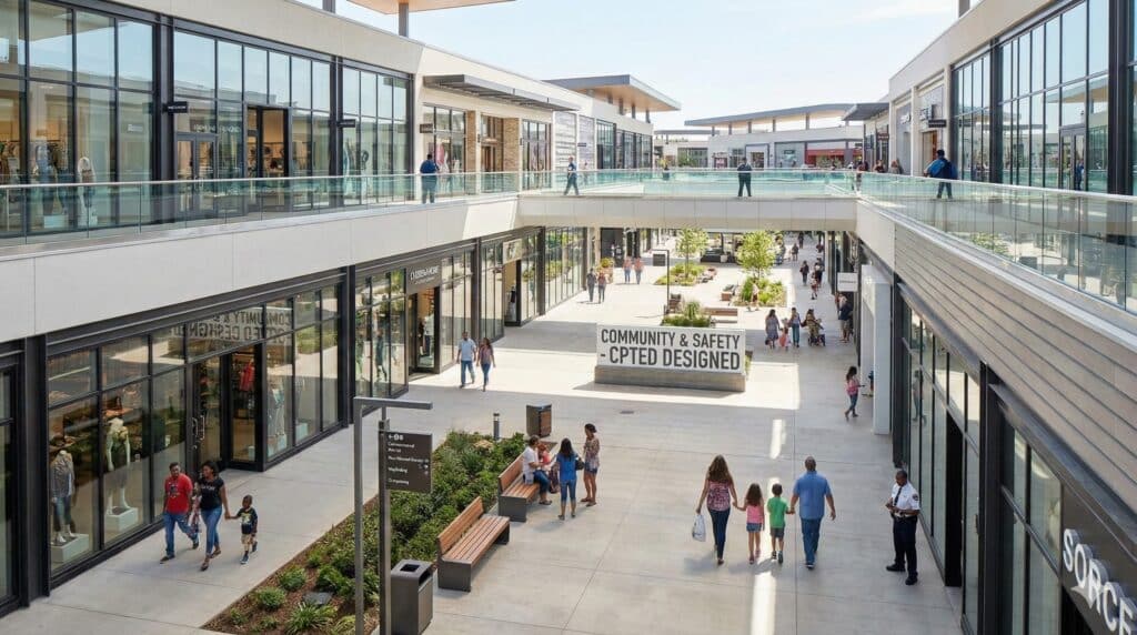 Standardul ISO 22341 identifică explicit centrele comerciale drept medii cu „caracteristici spațiale complexe care necesită strategii CPTED stratificate”, o recunoaștere a faptului că aceste spații combină zone publice, semi-publice și private într-o manieră care poate fie facilita, fie inhiba comportamentul infracțional. Standardul recomandă aplicarea concomitentă a supravegherii naturale, controlului accesului și întăririi teritoriale, nu ca măsuri izolate, ci ca sistem integrat.